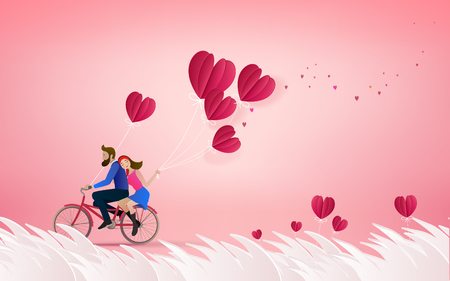 自転車に乗って白いハート風船を持っている男 愛のコンセプト ハッピーバレンタインデーの壁紙 ポスター カード ベクターの図 のイラスト素材 ベクタ Image