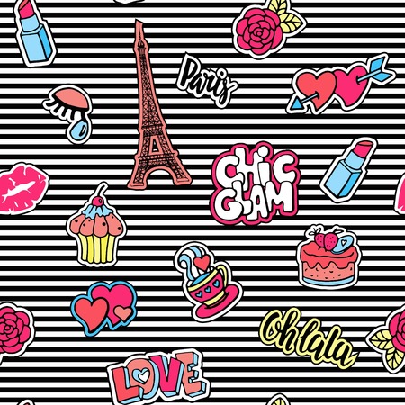 かわいいファッション パッチ バッジとシームレスなパターン 唇 ハート エッフェル塔 花 ケーキ 目 口紅 パリのロマンチックなデザイン のイラスト素材 ベクタ Image
